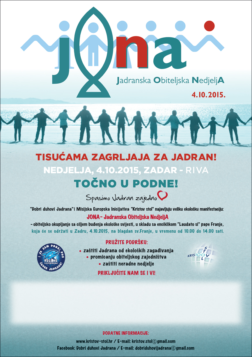 zajednički najavljuju veliku ekološku inicijativu - miroljubivo obiteljsko okupljanje s ciljem buđenja ekološke svijesti naziva JONA - Jadranska ObiteljskA Nedjelja.