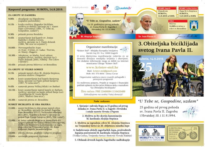 organizira 3. Zagrebačku Obiteljsku biciklijadu sv. Ivana Pavla II. u subotu 14. rujna 2019., u 9h, polazeći sa Zagrebačkog hipodroma na kojem se i odvio taj povijesni velebni susret Hrvata s Papom, uz posjet i molitvu kod drvenih kapela Zagrebačke nadbiskupije - na Bundeku i Jakuševcu, preko novozagrebačkih župa svetih Evanđelista, sa ciljem u crkvi sv. Benedikta u Mičevcu, gdje će se u 12h služiti sv. misa zahvalnica, nakon kojega slijedi kratki duhovno - zabavni program u suradnji sa KUD-om Mičevec.