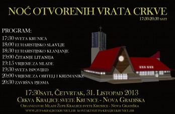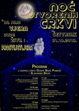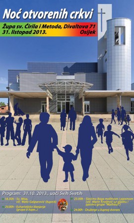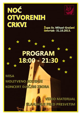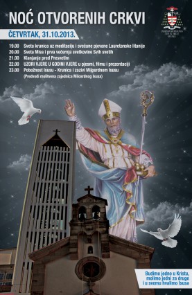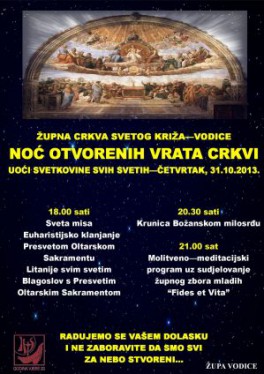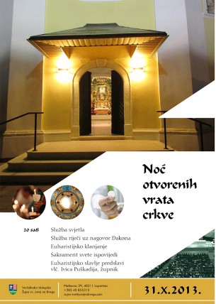 Ovim putem pozivamo sve vas da se 31. listopada 2013. godine u 20.00. odazovete našem pozivu i dođete u našu župnu crkvu na „Noć otvorenih vrata crkve“. Program se sastoji od nekoliko djelova. Nakon što se svi skupimo u 20.00 sati započet će Služba svjetla (za sve vas na ulazu u crkvu biti će pripremljene svijeće). Potom ćemo u Službi Riječi čuti Gospodina koji nam i danas govori i želi ući u našu svakodnevicu. Đakon, vlč. Silvio Košćak, održat će kratak nagovor nakon kojeg će svatko od prisutnih moći na papirić napisati svoju molitvu te ju donjeti pred Gospodina na oltar. Euharistijsko klanjanje, koje će uslijediti nakon Službe Riječi, svojom pjesmom uzveličat će Zbor mladih naše župe. U euharistijskom klanjanju zajedno čemo načiniti ispit savjesti, a cijelo vrijeme bit ćete u mogućnosti pristupiti sakramentu ispovjedi. Po završetku klanjanja vlč. Ivica Puškadija, župnik, predslavit će svečano euharistijsko slavlje.